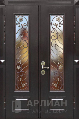 Входная двустворчатая дверь со стеклом и ковкой в загородный дом №14